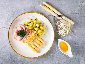 Zacht gegaarde asperges met bourgondische beenham, gekookt ei, krieltjes en botersaus